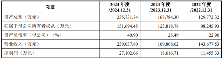 财务方面,于2022年度、2023年度、2024年度,公司实现营业收入分别约为14.37亿元、16.99亿元、23.90亿元人民币;同期,净利润分别约为1.15亿元、1.86亿元、2.71亿元人民币。